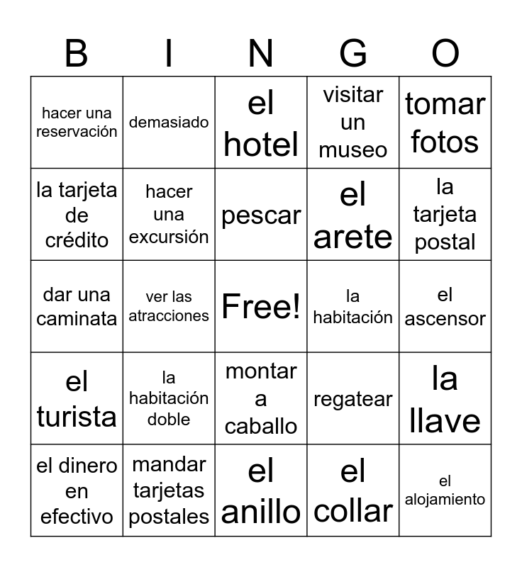 This bingo card has a free space and 41 words: acampar, dar una caminata, estar de vacaciones, hacer una excursión, mandar tarjetas postales, montar a caballo, pescar, el tiempo libre, tomar fotos, el turista, ver las atracciones, visitar un museo, el alojamiento, el ascensor, la habitación, la habitación doble, la habitación individual, hacer una reservación, el hostal, el hotel, la llave, la recepción, el anillo, el arete, las artesanías, las joyas, el collar, el recuerdo, la tarjeta postal, bello, caro, demasiado, el dinero en efectivo, el mercado al aire libre, regatear, la tarjeta de crédito, anteayer, el año pasado, el mes pasado, la semana pasada and Me gustaría....