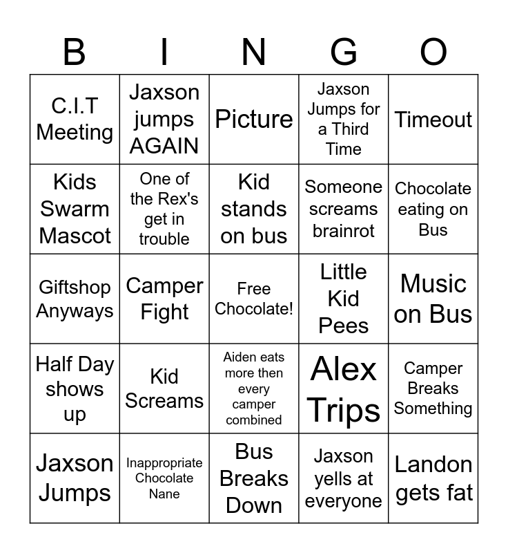 This bingo card has a free space and 24 words: Jaxson Jumps, Kid Screams, Kid stands on bus, Jaxson yells at everyone, Timeout, C.I.T Meeting, Jaxson jumps AGAIN, Picture, Little Kid Pees, Music on Bus, Giftshop Anyways, One of the Rex's get in trouble, Alex Trips, Camper Breaks Something, Kids Swarm Mascot, Inappropriate Chocolate Nane, Bus Breaks Down, Jaxson Jumps for a Third Time, Chocolate eating on Bus, Half Day shows up, Camper Fight, Aiden eats more then every camper combined, Someone screams brainrot and Landon gets fat.