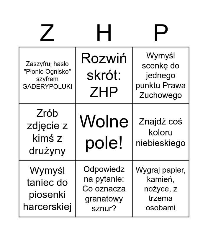 This bingo card has a free space and 8 words: Znajdź coś koloru niebieskiego, Wymyśl scenkę do jednego punktu Prawa Zuchowego, Rozwiń skrót: ZHP, Wymyśl taniec do piosenki harcerskiej, Zaszyfruj hasło "Płonie Ognisko" szyfrem GADERYPOLUKI, Wygraj papier, kamień, nożyce, z trzema osobami, Zrób zdjęcie z kimś z drużyny and Odpowiedz na pytanie: Co oznacza granatowy sznur?.