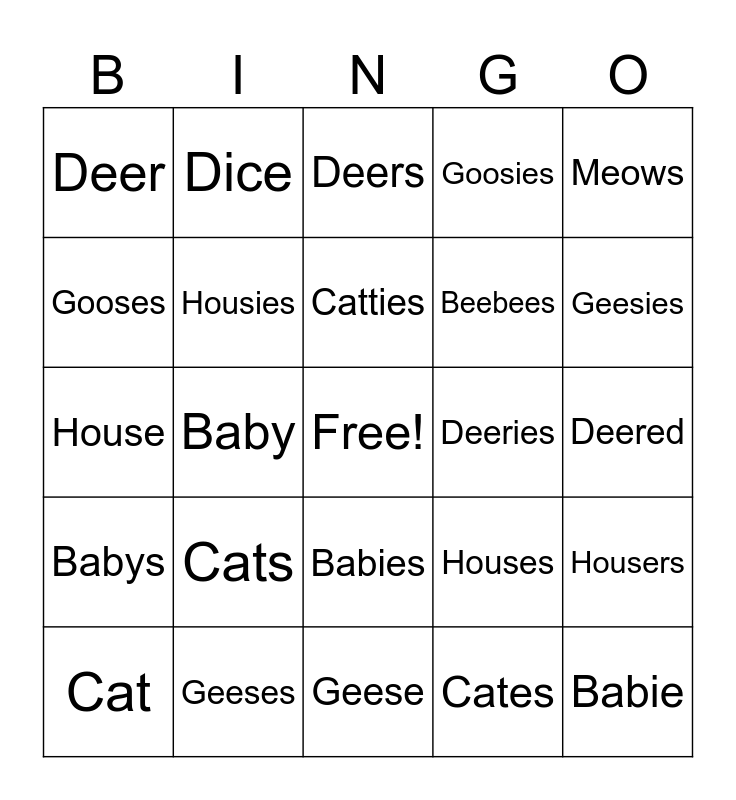 This bingo card has a free space and 24 words: Cat, Cats, Catties, Cates, Meows, Deer, Dice, Deers, Deeries, Deered, House, Housies, Houses, Housers, Gooses, Geeses, Geese, Goosies, Geesies, Babys, Baby, Babies, Beebees and Babie.