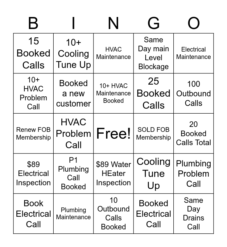 This bingo card has a free space and 24 words: Book Electrical Call, P1 Plumbing Call Booked, 10+ HVAC Maintenance Booked, Booked Electrical Call, Electrical Maintenance, 15 Booked Calls, 10+ Cooling Tune Up, HVAC Maintenance, SOLD FOB Membership, 20 Booked Calls Total, Renew FOB Membership, Booked a new customer, Cooling Tune Up, Plumbing Problem Call, 10+ HVAC Problem Call, Plumbing Maintenance, 10 Outbound Calls Booked, Same Day main Level Blockage, 100 Outbound Calls, $89 Electrical Inspection, HVAC Problem Call, $89 Water HEater Inspection, 25 Booked Calls and Same Day Drains Call.
