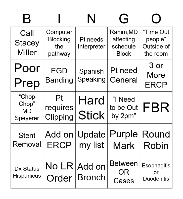 This bingo card has a free space and 24 words: Add on ERCP, No LR Order, Spanish Speaking, Dx Status Hispanicus, “Time Out people” Outside of the room, Call Stacey Miller, Poor Prep, Computer Blocking the pathway, “I Need to be Out by 2pm”, Update my list, Pt need General, “Chop Chop” MD Speyerer, Purple Mark, Round Robin, EGD Banding, Between OR Cases, FBR, Pt needs Interpreter, 3 or More ERCP, Pt requires Clipping, Esophagitis or Duodenitis, Stent Removal, Rahim,MD affecting schedule Block and Add on Bronch.