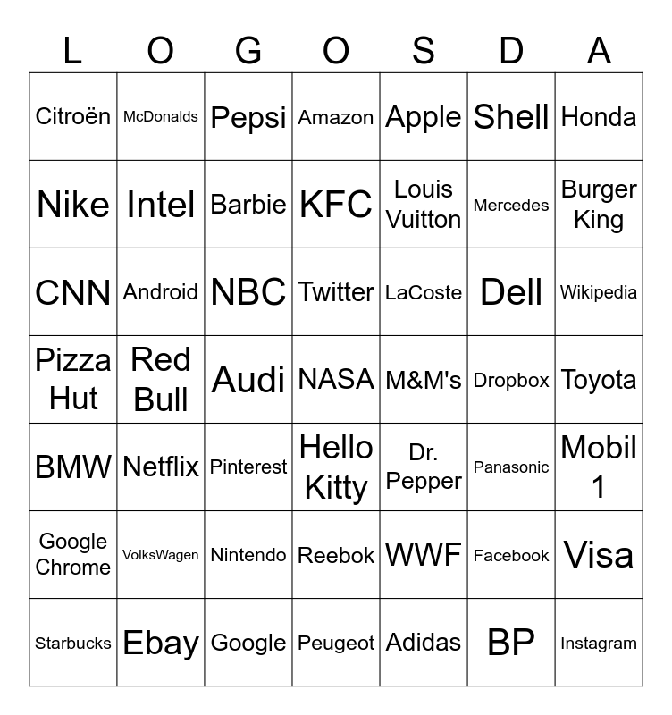 This bingo card has 49 words: Facebook, Mercedes, Adidas, Red Bull, NBC, Toyota, McDonalds, Google, Shell, Hello Kitty, Honda, Amazon, Dell, LaCoste, VolksWagen, Dropbox, Nike, Burger King, Visa, Apple, Louis Vuitton, Audi, Citroën, Intel, Starbucks, Barbie, Wikipedia, Ebay, Twitter, Android, Instagram, M&M's, Google Chrome, Nintendo, Pizza Hut, Dr. Pepper, Panasonic, Mobil 1, CNN, Pinterest, Reebok, BMW, NASA, Peugeot, KFC, Pepsi, WWF, Netflix and BP.