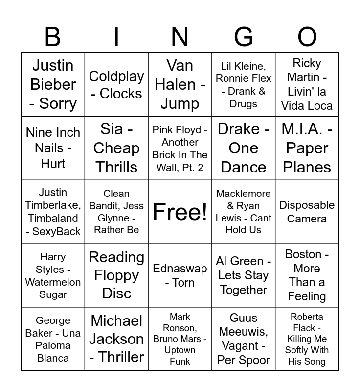 This bingo card has a free space and 141 words: 50 Cent - Ayo Technology, 50 Cent - In Da Club, a-ha - Take on Me, Adele - Someone Like You, Aerosmith - Dream On, Al Green - Lets Stay Together, Amy Winehouse - Rehab, Amy Winehouse - Valerie, Anouk - Nobodys Wife, Aqua - Barbie Girl, Avicii - Wake Me Up, Backstreet Boys - I Want It That Way, Beyonc‚ - Halo, Beyonc‚ - Single Ladies, Black Eyed Peas - I Gotta Feeling, Black Eyed Peas - Where Is The Love, Blackstreet - No Diggity, BLoF, Geike - Zoutelande, Bob Dylan - Knockin on Heavens Door, Bon Jovi - Livin On A Prayer, Bonnie Tyler - Total Eclipse of the Heart, Boston - More Than a Feeling, Britney Spears - Toxic, Bruno Mars - Locked out of Heaven, Cher - Believe, Clean Bandit, Jess Glynne - Rather Be, Coldplay - Clocks, Coldplay - Viva La Vida, Coolio, LV - Gangstas Paradise, Culture Club - Karma Chameleon, Cyndi Lauper - Girls Just Want to Have Fun, David Bowie - Heroes, De Jeugd Van Tegenwoordig - Sterrenstof, Disposable Camera, Dolly Parton - Jolene, Don McLean - American Pie, Donna Summer - Hot Stuff, Drake - Hotline Bling, Drake - One Dance, Dua Lipa, DaBaby - Levitating, Duran Duran - Hungry Like the Wolf, Ed Sheeran - Shape of You, Ednaswap - Torn, Eiffel 65, Gabry Ponte - Blue (Da Ba Dee), Elton John - Rocket Man, Elvis Presley - I Can't help falling in love with you, Eminem - Lose Yourself, Eurythmics, Annie Lennox, Dave Stewart - Sweet Dreams, Evanescence - Bring Me To Life, Fleetwood Mac - Go Your Own Way, Frankie Valli & The Four Seasons - Beggin', Game Boy startup screen, George Baker - Una Paloma Blanca, George Michael - Careless Whisper, Gers Pardoel - Ik Neem Je Mee, Glass Animals - Heat Waves, Gnarls Barkley - Crazy, Golden Earring - Radar Love, Gorillaz - Feel Good Inc, Green Day - Boulevard of Broken Dreams, Guns N Roses - Sweet Child O Mine, Guus Meeuwis, Vagant - Per Spoor, Gwen Stefani - Hollaback Girl, Hanson - MMMBop, Harry Styles - As it Was, Harry Styles - Watermelon Sugar, Hoobastank - The Reason, Ike & Tina Turner - Proud Mary, Imagine Dragons - Radioactive, Irene Cara - Flashdance What a Feeling, Jody Bernal - Que Si, Que No, Justin Bieber - Sorry, Justin Timberlake, Timbaland - SexyBack, Katy Perry - Firework, Katy Perry - Roar, Kelly Clarkson - Since U Been Gone, Kris Kross Amsterdam - Hij Is Van Mij, Lewis Capaldi - Someone You Loved, Lil Kleine, Ronnie Flex - Drank & Drugs, Linda Roos & Jessica - Ademnood, Lorde - Royals, Los Del Rio - Macarena, Lou Bega - Mambo No. 5, Luis Fonsi, Daddy Yankee - Despacito, M.I.A. - Paper Planes, Maan, Goldband - Stiekem, Macklemore & Ryan Lewis - Cant Hold Us, Madonna - Like a Prayer, Mark Ronson, Bruno Mars - Uptown Funk, Maroon 5 - Memories, Meghan Trainor - All About That Bass, Michael Jackson - Beat It, Michael Jackson - Smooth Criminal, Michael Jackson - Thriller, Microsoft Windows 95 Startup Sound, Microsoft Windows XP Startup Sound, Miley Cyrus - Party In The U.S.A., MSN Messenger sound, Natalie Imbruglia - Torn, Nelly - Hot In Herre, Nine Inch Nails - Hurt, NOKIA RINGTONE, OneRepublic - Counting Stars, Pharrell Williams - Happy, Pink Floyd - Another Brick In The Wall, Pt. 2, Post Malone - Sunflower, Prince - Nothing Compares 2 U, Playstation 1 startup sound, R.E.M. - Losing My Religion, Reading Floppy Disc, Red Hot Chili Peppers - Under the Bridge, Rewind VHS TAPE, Ricky Martin - Livin' la Vida Loca, Roberta Flack - Killing Me Softly With His Song, Shocking Blue - Venus, Sia - Cheap Thrills, Simon and Garfunkel - The Sound Of Silence, Sixpence None The Richer - Kiss Me, Soft Cell - Tainted Love, Survivor - Eye of the Tiger, Taylor Swift - Shake It Off, That sound your old pc speaker does when you receive a phone call, The Chainsmokers, Halsey - Closer, The Kid LAROI - STAY, The Killers - Mr. Brightside, The Neighbourhoud - Sweater Weather, The Police - Every Breath You Take, The Sound of dial-up Internet, The Verve - Bitter Sweet Symphony, The Weeknd - Blinding Lights, The Weeknd, Daft Punk - Starboy, TLC - Waterfalls, Tones And I - Dance Monkey, TOTO - Africa, TV Static Sound Effect, UB40 - Red Red Wine, Van Halen - Jump, Vanessa Carlton - A Thousand Miles, Vanilla Ice - Ice Ice Baby, Wham! - Wake Me Up Before You Go-Go and Will Smith - Summertime.