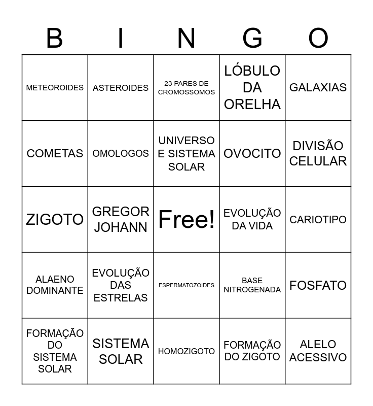 This bingo card has a free space and 24 words: EVOLUÇÃO DAS ESTRELAS, SISTEMA SOLAR, UNIVERSO E SISTEMA SOLAR, FORMAÇÃO DO SISTEMA SOLAR, GALAXIAS, METEOROIDES, COMETAS, ASTEROIDES, EVOLUÇÃO DA VIDA, ESPERMATOZOIDES, OVOCITO, ZIGOTO, BASE NITROGENADA, FOSFATO, OMOLOGOS, FORMAÇÃO DO ZIGOTO, CARIOTIPO, 23 PARES DE CROMOSSOMOS, DIVISÃO CELULAR, GREGOR JOHANN, ALELO ACESSIVO, ALAENO DOMINANTE, LÓBULO DA ORELHA and HOMOZIGOTO.