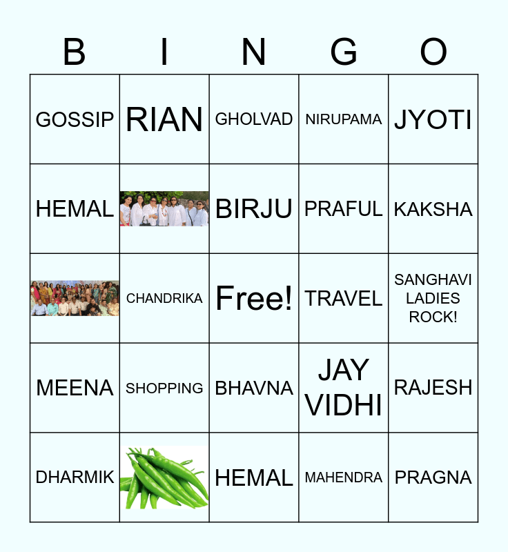 This bingo card has 5 images, a free space and 36 words: BHAVNA, BIRJU, BRAHMI, JYOTI, MEENA, CHANDRIKA, NIRUPAMA, PRAGNA, SANGHAVI LADIES ROCK!, TRAVEL, SHOPPING, NASTA, GOSSIP, MAHAVIR BHAGWAN NI JAY, GHOLVAD, RAJESH, BHAVESH, HEMAL, PRAFUL, DHIREN, DHIRAJ LAL, MAHENDRA, BAKUL, KAKSHA, HARSH, NAMAN, RIAN, DHARMIK, JAINA, JAY VIDHI, HEMAL, KOMAL, KHUSBHOO, NISCHINT, ANKITA and HARITA.