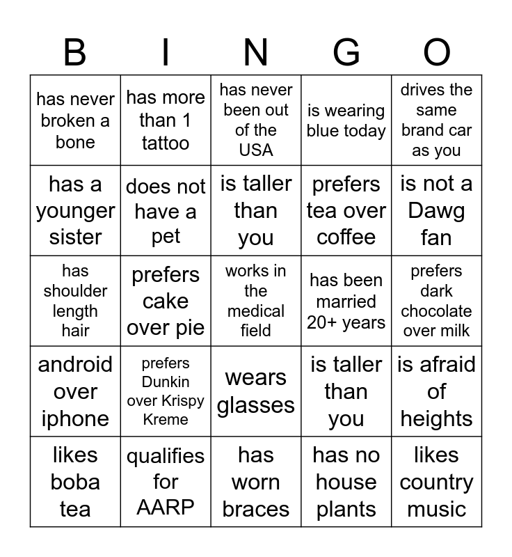 This bingo card has a free space and 24 words: prefers Dunkin over Krispy Kreme, qualifies for AARP, is taller than you, likes boba tea, drives the same brand car as you, has never broken a bone, has a younger sister, has more than 1 tattoo, has been married 20+ years, wears glasses, prefers tea over coffee, has shoulder length hair, is taller than you, is afraid of heights, does not have a pet, has no house plants, prefers dark chocolate over milk, has never been out of the USA, is not a Dawg fan, prefers cake over pie, likes country music, android over iphone, is wearing blue today and has worn braces.