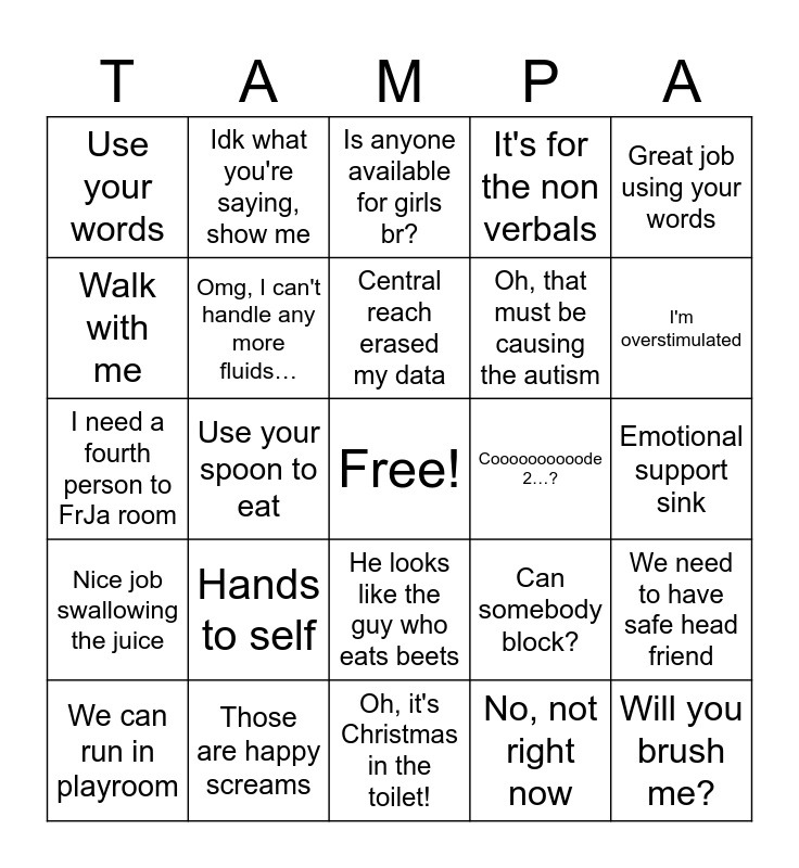 This bingo card has a free space and 24 words: Hands to self, Those are happy screams, Central reach erased my data, We can run in playroom, Great job using your words, Use your words, Walk with me, Idk what you're saying, show me, Coooooooooode 2…?, He looks like the guy who eats beets, Oh, that must be causing the autism, I need a fourth person to FrJa room, Can somebody block?, We need to have safe head friend, Omg, I can't handle any more fluids…, No, not right now, Emotional support sink, Is anyone available for girls br?, I'm overstimulated, Use your spoon to eat, Will you brush me?, Nice job swallowing the juice, It's for the non verbals and Oh, it's Christmas in the toilet!.