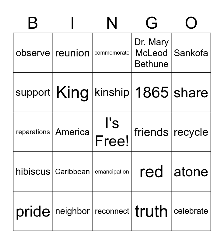 ⚠ This card has duplicate items: Juneteenth (2), 1865 (2), honor (4), celebrate (2), freedom (2), America (2), Africa (2), diaspora (2), Caribbean (2), enslaved (2), history (2), Sankofa (2), family (2), friends (2), independence (2), emancipation (2), Black (2), people (2), red (4), green (2), Marcus Garvey (2), share (2), care (2), atone (2), reparations (2), power (2), holiday (2), birthday (2), children (2), June 19th (2), the Burst (2), the Arc (2), the Star (2), neighbor (2), Great Migration (2), fellowship (2), white (2), blue (2), kinship (2), flag (4), summer (2), fight (2), teach (2), truth (2), commemorate (2), fun (2), observe (2), hibiscus (2), laughter (2), joy (2), 13th Amendment (2), discipline (2), build (2), pride (2), culture (2), influence (2), King (2), Queen (2), African-American (2), Afro-American (2)