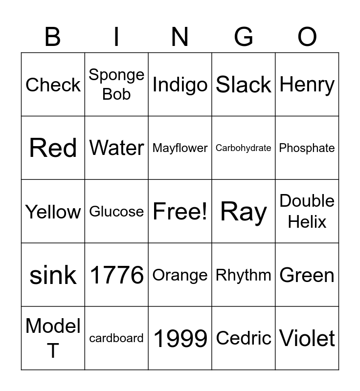 This bingo card has a free space and 25 words: 1776, 1999, Mayflower, Model T, Henry, Check, Red, Sponge Bob, Ray, Orange, Carbohydrate, Yellow, Rhythm, Green, Water, Blue, Double Helix, Indigo, Phosphate, Glucose, Violet, cardboard, sink, Slack and Cedric.