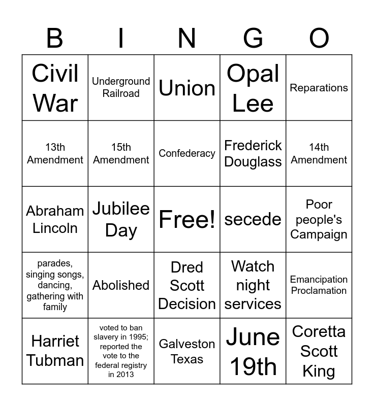 This bingo card has a free space and 24 words: Abolished, voted to ban slavery in 1995; reported the vote to the federal registry in 2013, Confederacy, Harriet Tubman, Reparations, Civil War, 13th Amendment, Underground Railroad, secede, Dred Scott Decision, Frederick Douglass, Abraham Lincoln, Watch night services, Emancipation Proclamation, 15th Amendment, June 19th, Poor people's Campaign, Union, 14th Amendment, Jubilee Day, Coretta Scott King, parades, singing songs, dancing, gathering with family, Opal Lee and Galveston Texas.