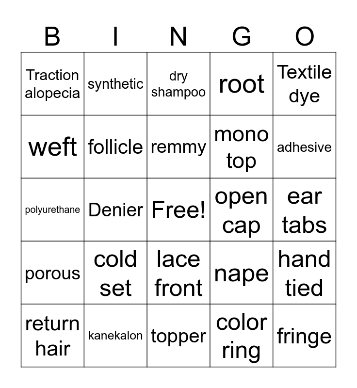 This bingo card has a free space and 24 words: cold set, kanekalon, remmy, return hair, Textile dye, Traction alopecia, weft, synthetic, open cap, lace front, mono top, polyurethane, nape, hand tied, follicle, color ring, ear tabs, dry shampoo, adhesive, Denier, fringe, porous, root and topper.