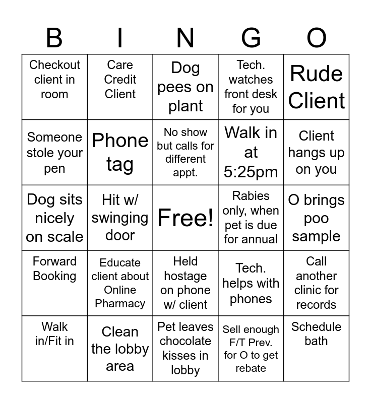 This bingo card has a free space and 24 words: Educate client about Online Pharmacy, Clean the lobby area, No show but calls for different appt., Walk in/Fit in, Rude Client, Checkout client in room, Someone stole your pen, Care Credit Client, Rabies only, when pet is due for annual, Held hostage on phone w/ client, Walk in at 5:25pm, Dog sits nicely on scale, Tech. helps with phones, Call another clinic for records, Phone tag, Sell enough F/T Prev. for O to get rebate, O brings poo sample, Dog pees on plant, Client hangs up on you, Hit w/ swinging door, Schedule bath, Forward Booking, Tech. watches front desk for you and Pet leaves chocolate kisses in lobby.