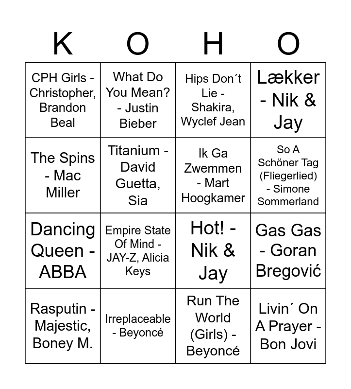 This bingo card has 28 words: Kun For Mig - Medina, Kender Ik´I Morgen - Gilli, Dancing Queen - ABBA, Don´t Start Now - Dua Lipa, Titanium - David Guetta, Sia, Hips Don´t Lie - Shakira, Wyclef Jean, What Do You Mean? - Justin Bieber, Livin´ On A Prayer - Bon Jovi, Irreplaceable - Beyoncé, Hot N Cold - Katy Perry, Hot! - Nik & Jay, Lækker - Nik & Jay, Pump It - Black Eyed Peas, Pimp - Bacao Rhythm & Steel Band, Empire State Of Mind - JAY-Z, Alicia Keys, Survivor - Destiny´s Child, It´s Not Right But It´s Okay - Mr. Belt & Wezol, Ik Ga Zwemmen - Mart Hoogkamer, So A Schöner Tag (Fliegerlied) - Simone Sommerland, DtMF - Bad Bunny, CPH Girls - Christopher, Brandon Beal, Fireball - Pitbull, John Ryan, Rasputin - Majestic, Boney M., Gas Gas - Goran Bregović, Run The World (Girls) - Beyoncé, And We Danced - Macklemore, Ziggy Stardust, The Spins - Mac Miller and YMCA - Village People.