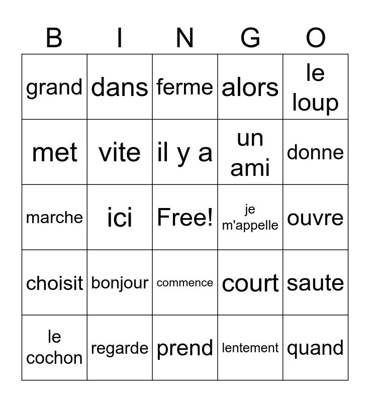This bingo card has a free space and 24 words: bonjour, regarde, il y a, le cochon, le loup, grand, met, dans, je m'appelle, commence, un ami, marche, court, saute, vite, lentement, ouvre, ferme, donne, ici, quand, choisit, alors and prend.