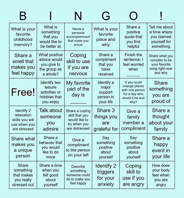 This bingo card has 36 words: Say something positive about yourself, Give a compliment to the person on your left, Identify 2 triggers for your anxiety, Share a smell that makes you feel happy, Identify 2 relaxation skills you will use when you are stressed, Identify a major support person in your life, What positive advice would you give to the group as a whole?, Describe something someone could do to make you feel happy, Share a positive quote that you find helpful, Say something positive about yourself, Share what you consider to be your favorite song right now and why, What is your favorite place and why, Share a happy event in your life, Identify two leisure activities or hobbies that you enjoy, Share a compliment that you have received, What is your favorite childhood memory?, Share what makes you a unique person, If you could change places with one person for a day who would it be and why?, Free!, Name a personal accomplishment that made you proud, My favorite part of the day is ______, Talk about someone you admire, Share 3 things you are grateful for, Share a coping skill that you would like to try when you are distressed, Give a family member a compliment, What is something that you would like to be better at, Finish the sentence: I feel worried when ______, Share a time when you felt good about yourself, Coping skill to use if you are nervous, Tell me about a time where you blamed yourself for something, How does your body feel when you are angry, Share something that makes you really stressed out, Share a thought about your family, Share something you are proud of, Share a behavior that you would like to do more and Coping skill to use if you are angry.