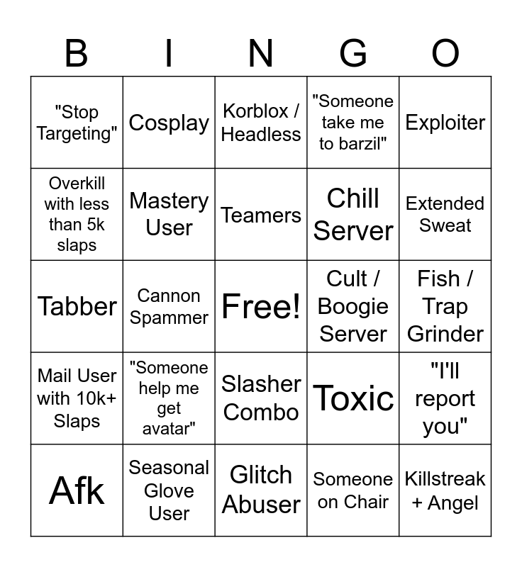 This bingo card has a free space and 24 words: "Someone help me get avatar", Seasonal Glove User, Teamers, Afk, Exploiter, "Stop Targeting", Overkill with less than 5k slaps, Cosplay, Cult / Boogie Server, Slasher Combo, Chill Server, Tabber, Toxic, "I'll report you", Mastery User, Someone on Chair, Fish / Trap Grinder, Korblox / Headless, Extended Sweat, Cannon Spammer, Killstreak + Angel, Mail User with 10k+ Slaps, "Someone take me to barzil" and Glitch Abuser.