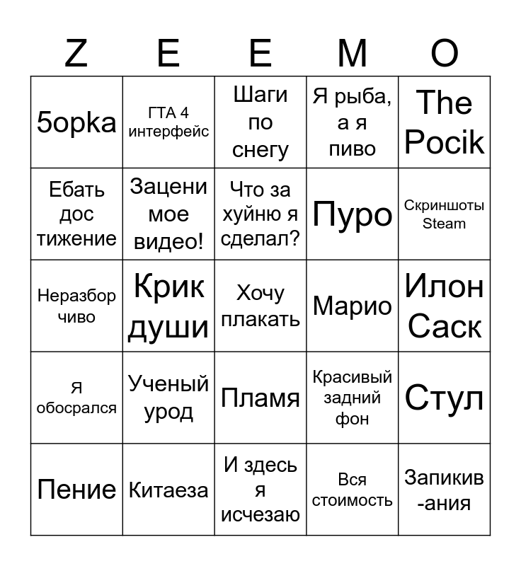 This bingo card has a free space and 24 words: Ученый урод, Китаеза, Что за хуйню я сделал?, Пение, The Pocik, 5opka, Ебать дос тижение, ГТА 4 интерфейс, Марио, Пламя, Пуро, Неразбор чиво, Красивый задний фон, Стул, Зацени мое видео!, Вся стоимость, Илон Саск, Шаги по снегу, Скриншоты Steam, Крик души, Запикив -ания, Я обосрался, Я рыба, а я пиво and И здесь я исчезаю.