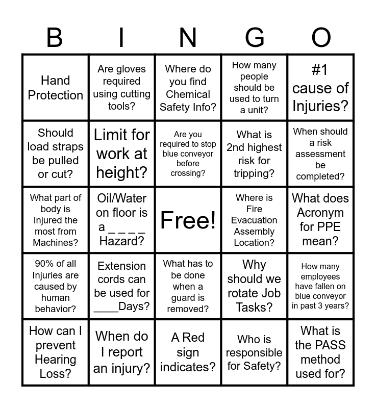 This bingo card has a free space and 29 words: How can I prevent Hearing Loss?, How can I protect my Eye's?, Oil/Water on floor is a _ _ _ _ Hazard?, Materials left on floor is a _ _ _ _ Hazard?, Hand Protection, Where do you find Chemical Safety Info?, Limit for work at height?, Extension cords can be used for ____Days?, Where is Fire Evacuation Assembly Location?, When do I report an injury?, What does Acronym for PPE mean?, What is the PASS method used for?, A Red sign indicates?, Who is responsible for Safety?, When should a risk assessment be completed?, All chemical containers must have a _ _ _ _ _?, What has to be done when a guard is removed?, 90% of all Injuries are caused by human behavior?, #1 cause of Injuries?, What part of body is Injured the most from Machines?, Why should we rotate Job Tasks?, Item found on floor that is the highest risk for tripping?, What is 2nd highest risk for tripping?, Should load straps be pulled or cut?, How many people should be used to turn a unit?, Are gloves required using cutting tools?, How many employees have fallen on blue conveyor in past 3 years?, Are you required to stop blue conveyor before crossing? and How many times per day should you remind others to work safely?.