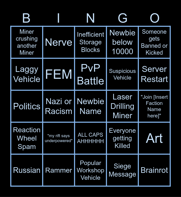 This bingo card has a free space and 59 words: Preset Vehicle, Rammer, Miner, Reaction Wheel Spam, Siege Message, Solar Block Spam, FEM, Swearing, Suspicious Vehicle, Factionless Player, Newbie below 10000, Special Tag ([Mod], [Helper], ect), Laggy Vehicle, Tiny Block Spam, Desync, Miner crushing another Miner, Brainrot, Someone gets Banned or Kicked, Rule Break, PvP Battle, Laser Drilling Miner, Inefficient Storage Blocks, Russian, Art, Role-playing, Chat from Discord User, Impossible Name, Impossible Faction Tag, Server Restart, Someone saying their age is a number below 10, File Edited Vehicle, Medium Vehicle Rifted from Astrin, Concentrated Lasers, "AI" Drone, Nerve, Gunwall, Fully Maxed Small Grid, Nazi or Racism, "i will report", Politics, "where can i find titanium?", "my rift says underpowered", "Join [Insert Faction Name here]", "pls help me, i ran out of fuel", Very Poorly Designed Vehicle, Not Compact Logic, Over 16 Players Online, Blocks Clogging the Launchpad, ALL CAPS AHHHHHH, Popular Workshop Vehicle, 3 People in the same Faction Online, Annoying, Faction Tag that has Nunbers, Emojis, Desync Pistons or Hinges, Everyone getting Killed, Newbie thinks they are better than everyone else, Armed Miner and Death by Desync.