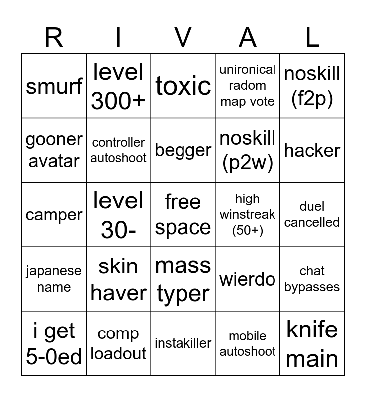 This bingo card has a free space and 24 words: skin haver, comp loadout, begger, i get 5-0ed, noskill (f2p), smurf, gooner avatar, level 300+, high winstreak (50+), mass typer, noskill (p2w), camper, wierdo, chat bypasses, controller autoshoot, mobile autoshoot, duel cancelled, toxic, hacker, level 30-, knife main, japanese name, unironical radom map vote and instakiller.