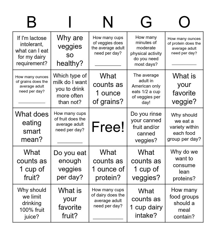 This bingo card has a free space and 24 words: Do you eat enough veggies per day?, What is your favorite fruit?, What counts as 1 ounce of grains?, Why should we limit drinking 100% fruit juice?, How many ounces of protein does the average adult need per day? ___________, If I'm lactose intolerant, what can I eat for my dairy requirement?, How many ounces of grains does the average adult need per day? ____________, Why are veggies so healthy?, Do you rinse your canned fruit and/or canned veggies?, What counts as 1 ounce of protein?, The average adult in American only eats 1/2 a cup of veggies per day!, What does eating smart mean?, What counts as 1 cup of veggies?, Why do we want to consume lean proteins?, Which type of milk do I want you to drink more often than not?, What counts as 1 cup dairy intake?, Why should we eat a variety within each food group per day?, How many cups of veggies does the average adult need per day? ___________, What is your favorite veggie?, How many cups of fruit does the average adult need per day? __________, How many food groups should a meal contain?, What counts as 1 cup of fruit?, How many minutes of moderate physical activity do you need most days? and How many cups of dairy does the average adult need per day? ____________.