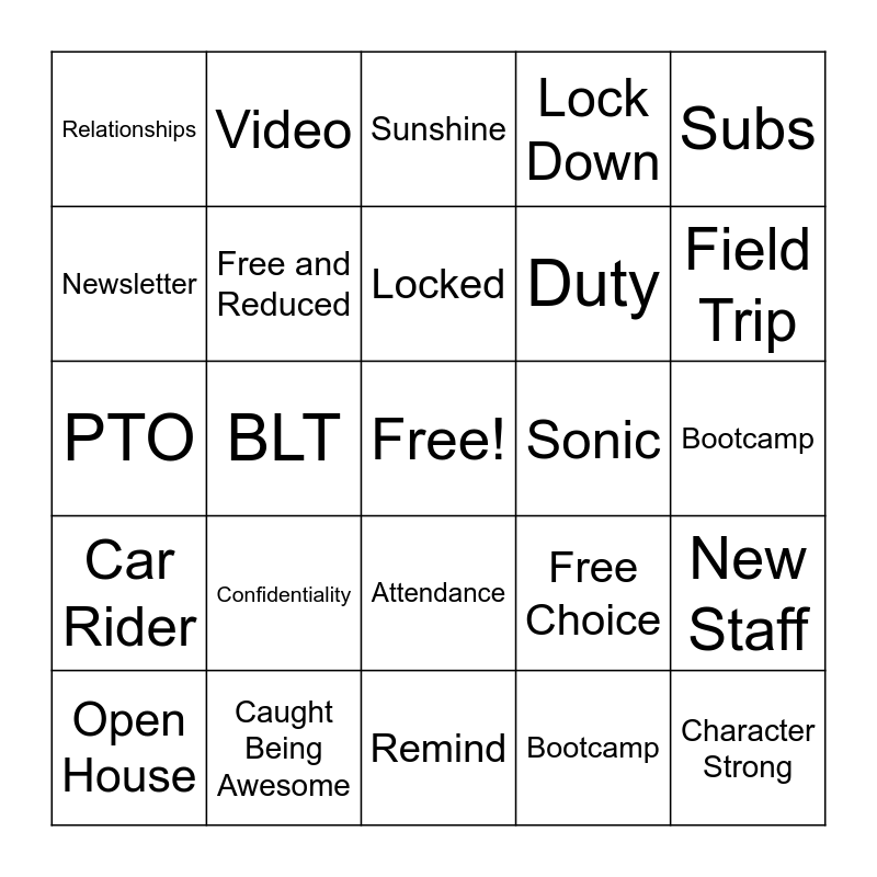 This bingo card has a free space and 25 words: Confidentiality, Remind, Locked, Open House, Subs, Relationships, Newsletter, Video, Sonic, Attendance, Duty, PTO, Free Choice, New Staff, Free and Reduced, Focus, Bootcamp, Sunshine, Field Trip, BLT, Character Strong, Caught Being Awesome, Car Rider, Lock Down and Bootcamp.