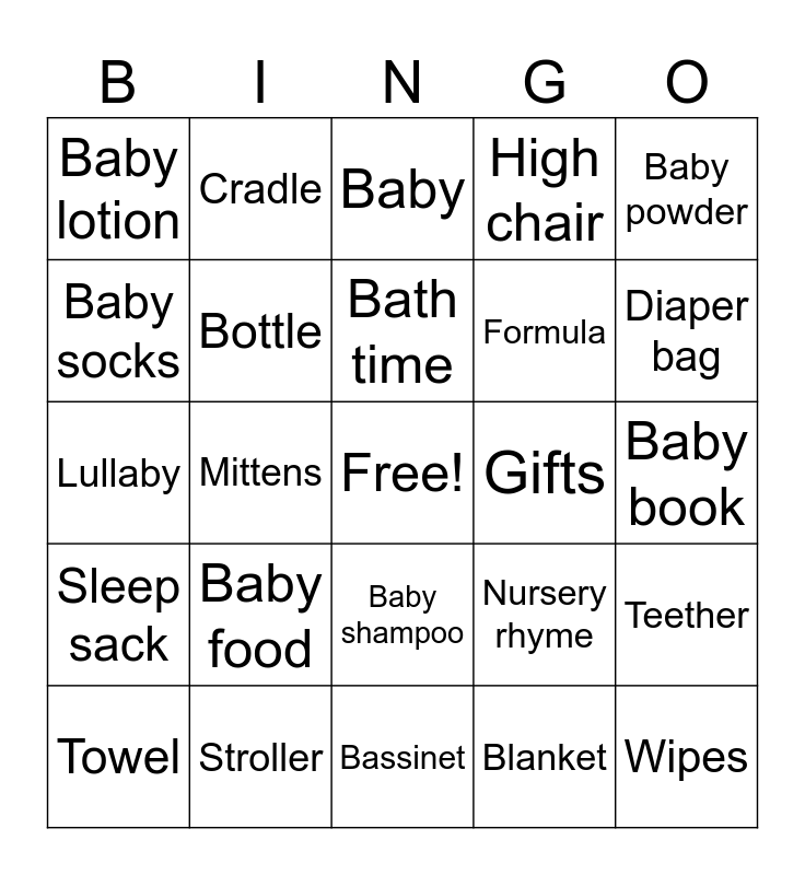 This bingo card has a free space and 46 words: Diapers, Baby shampoo, Baby carrier, Mittens, Nursery rhyme, Nursery, Bath time, ., Baby powder, Booties, High chair, Baby socks, Pacifier, Teether, Burp cloth, Onesie, Lullaby, Crying, Mobiles, Cradle, Gifts, Milk, Baby, Diaper bag, Stuffed doll, Formula, Towel, Newborn, Baby book, Bottle, Rattle, Diaper pins, Playpen, Wipes, Bib, Blanket, Sleep sack, Teething ring, Clothes, Baby food, Baby monitor, Baby lotion, Bassinet, Baby bathtub, Stroller and Teddy bear.