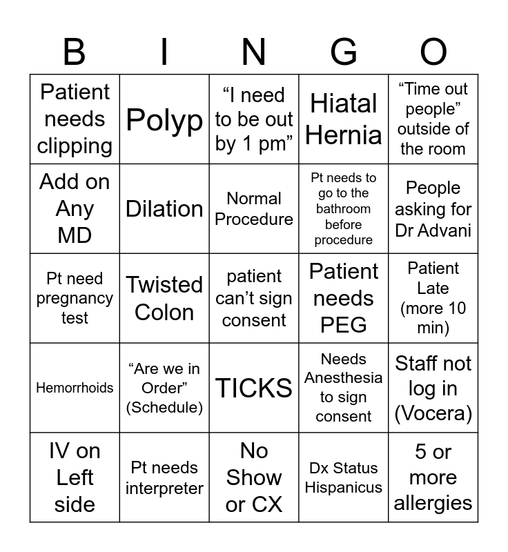 This bingo card has 25 words: “Are we in Order” (Schedule), No Show or CX, Normal Procedure, IV on Left side, “Time out people” outside of the room, Patient needs clipping, Add on Any MD, Polyp, Patient needs PEG, TICKS, Pt needs to go to the bathroom before procedure, Pt need pregnancy test, Needs Anesthesia to sign consent, Staff not log in (Vocera), Dilation, 5 or more allergies, Patient Late (more 10 min), “I need to be out by 1 pm”, People asking for Dr Advani, Twisted Colon, patient can’t sign consent, Pt needs interpreter, Hemorrhoids, Hiatal Hernia and Dx Status Hispanicus.