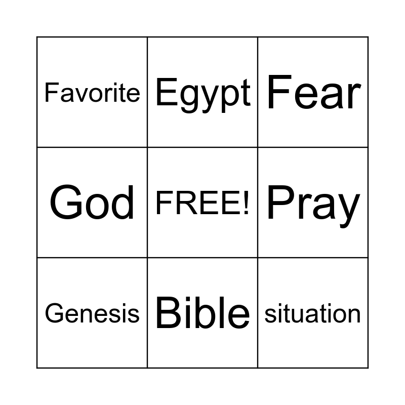 This bingo card has a free space and 17 words: Test, Forgive, Fear, Favorite, Joseph, God, Heart, Genesis, Bible, Pray, prison, hurt, situation, Egypt, Jesus, Hebrews and Lord.