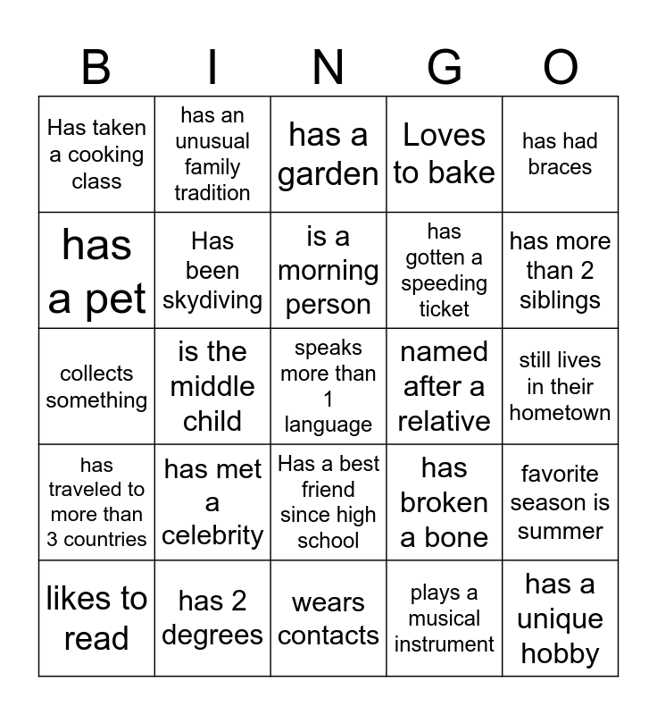 This bingo card has 30 words: has 2 degrees, has a birthday in the same month as you, is the middle child, grew up on a dairy farm, Has taken a cooking class, has a garden, Has been skydiving, Has a best friend since high school, named after a relative, wears contacts, still lives in their hometown, speaks more than 1 language, plays a musical instrument, has a unique hobby, has more than 2 siblings, cheers for a NFL team other than the Packers, has broken a bone, has traveled to more than 3 countries, has met a celebrity, has had braces, collects something, has more than 1 tattoo, has an unusual family tradition, has gotten a speeding ticket, has a pet, Loves to bake, favorite season is summer, likes to read, is a morning person and likes pineapple on pizza.