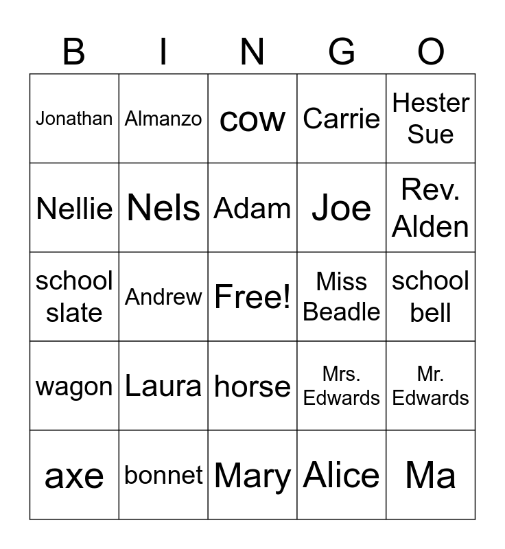 This bingo card has a free space and 49 words: Eliza, Ma, Pa, Mary, Laura, Grace, Almanzo, Willie, Nellie, Harriet, Nels, Carrie, Mr. Edwards, Mrs. Edwards, Percival, Albert, Adam, Miss Beadle, Doc Baker, Hester Sue, Andrew, Alice, Jonathan, Joe, Lars, Rev. Alden, axe, water pails, horse, wagon, plow, Hanson Lumber, school, Oleson's Store, bonnet, apron, suspenders, fishing, school bell, Nellie's Restaurant, stage coach, train, Jack, Pa's hat, school slate, cow, swimming, glasses and water pump.