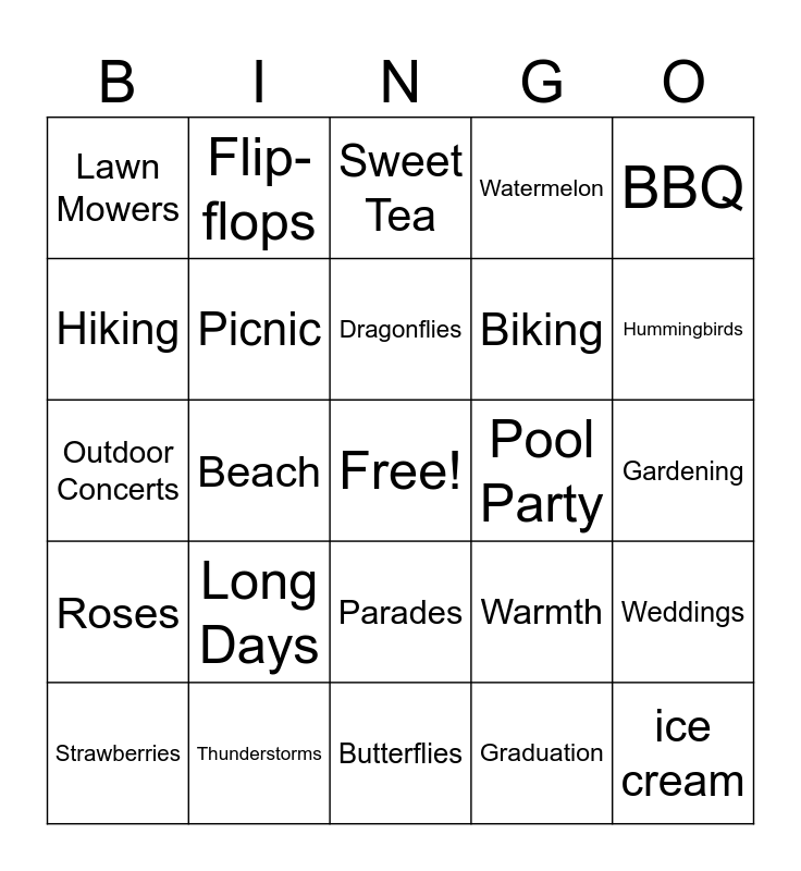 This bingo card has a free space and 32 words: Graduation, Father's Day, Beach, Vacation, Roses, Picnic, BBQ, Weddings, Flip-flops, Sunscreen, Dragonflies, Sweet Tea, Fireflies, Camping, Pool Party, Lemonade, Strawberries, Outdoor Concerts, Parades, Long Days, Warmth, Fishing, Gardening, Thunderstorms, ice cream, Watermelon, Biking, Hiking, Lawn Mowers, Butterflies, Grilling and Hummingbirds.