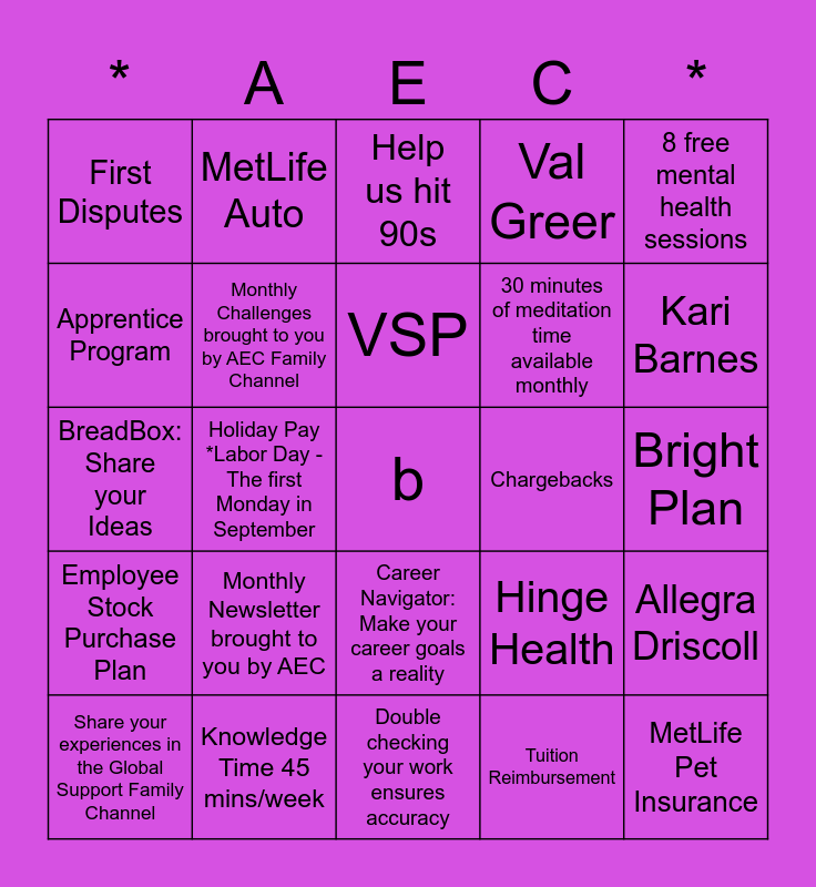 This bingo card has a free space and 94 words: Teamwork makes the dream work, Bread Financial Cares, Double checking your work ensures accuracy, Utilize your Team Channels for questions or help with your case, You can use your FSA card for medical supplies, Use yur checklist to ensure all steps have been completes with each case, Annual $400 Wellness Reward, Share your experiences in the Global Support Family Channel, Don't assume, verify and confirm, Schedule time with a SME for help with resolving complex cases, Getting proper rest, ensures your best, 72 hours of PSL+ time granted annually, You can share your pictures in the Global Support Family Channel, 30 minutes of meditation time available monthly, Free online fitness classes available, 8 free mental health sessions, Help us hit 90s, Neutral…don’t go there, "Booyah!" – Celebrate every completed survey like a victory., "Let's Bounce"... into the 90's, Get the 411 with AE, "All that and a bag of chips!" – your feedback makes the survey all that., "Kickin’ it old school!" – A fun way to say your opinions matters., Dont wait around to be "Saved by the Bell" complete the 2025 survey, Monthly Newsletter brought to you by AEC, Monthly Challenges brought to you by AEC Family Channel, New Galaxy Award brought to you by the AEC, Monthly Round of Applause Spotlight Winners brought to you by AEC, Global Voice brought to you by AEC, Growth & Development 2 hours/month, Knowledge Time 45 mins/week, Career Navigator: Make your career goals a reality, Extra Mile Award, Spring Health - Coping with Holiday Blues and Stress, MetLife Auto, T. Rowe 401k, Hall of Fame Award, Doctor on Demand, VSP, Hinge Health, BreadBox: Share your Ideas, Employee Stock Purchase Plan, Bright Plan, MetLife Home, MetLife Pet Insurance, BreadQuarters Associate Spotlight, MetLife Prepaid Legal, iPay for paystubs and tax documents, FlexWage Pay, Dependent Care Flexible Spending Account, Hinge Health, Tuition Reimbursement, Temporary Stretch Assignments, Virtual Benefits Fair, Holiday Pay *New Year’s Day – January 1, Holiday Pay *Martin Luther King, Jr. Day - The third Monday in January, Holiday Pay *President's Day – The third Monday in February, Holiday Pay *Memorial Day - The last Monday in May, Holiday Pay *Juneteenth - June 19, Holiday Pay *Independence Day - July 4, Holiday Pay *Labor Day - The first Monday in September, Holiday Pay *Columbus Day / Indigenous Peoples' Day - The second Monday in October, Holiday Pay *Veterans Day - November 11, Holiday Pay *Thanksgiving Day - The fourth Thursday in November, Holiday Pay *Christmas Day - December 25, ACT Associate Surveys, Activities provided by AEC for ACT Surveys, Inclusion & Belonging, Apprentice Program, Quarterly In-Person Anniversary Celebrations, Operational Excellence, Roundtables, Kim Prange, Ralph Andretta, Val Greer, Dinah Garcia Tolley, Tammy McConnaughey, Kari Barnes, Allegra Driscoll, Perry Beberman, Joseph Motes, Associate Discounts (Benefit Hub and Tickets-at-work), Credit Bureau, Chargebacks, First Disputes, Fiserv, DocuWare, EASE, Policy Adjustment, Finance Charges, KANA, Cease & Desist, FCRA and NON-FCRA.