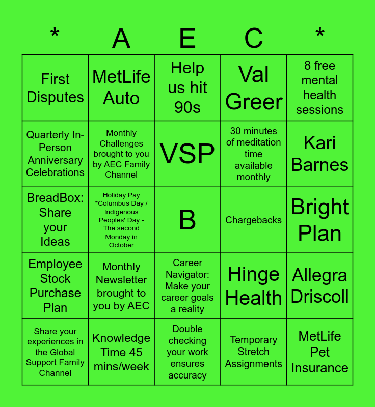 This bingo card has a free space and 93 words: Teamwork makes the dream work, Bread Financial Cares, Double checking your work ensures accuracy, Utilize your Team Channels for questions or help with your case, You can use your FSA card for medical supplies, Use yur checklist to ensure all steps have been completes with each case, Annual $400 Wellness Reward, Share your experiences in the Global Support Family Channel, Don't assume, verify and confirm, Schedule time with a SME for help with resolving complex cases, Getting proper rest, ensures your best, 72 hours of PSL+ time granted annually, You can share your pictures in the Global Support Family Channel, 30 minutes of meditation time available monthly, Free online fitness classes available, 8 free mental health sessions, Help us hit 90s, Neutral…don’t go there, "Booyah!" – Celebrate every completed survey like a victory., "Let's Bounce"... into the 90's, Get the 411 with AE, "All that and a bag of chips!" – your feedback makes the survey all that., "Kickin’ it old school!" – A fun way to say your opinions matters., Dont wait around to be "Saved by the Bell" complete the 2025 survey, Monthly Newsletter brought to you by AEC, Monthly Challenges brought to you by AEC Family Channel, New Galaxy Award brought to you by the AEC, Monthly Round of Applause Spotlight Winners brought to you by AEC, Global Voice brought to you by AEC, Growth & Development 2 hours/month, Knowledge Time 45 mins/week, Career Navigator: Make your career goals a reality, Extra Mile Award, Spring Health - Coping with Holiday Blues and Stress, MetLife Auto, T. Rowe 401k, Hall of Fame Award, Doctor on Demand, VSP, Hinge Health, BreadBox: Share your Ideas, Employee Stock Purchase Plan, Bright Plan, MetLife Home, MetLife Pet Insurance, BreadQuarters Associate Spotlight, MetLife Prepaid Legal, iPay for paystubs and tax documents, FlexWage Pay, Dependent Care Flexible Spending Account, Tuition Reimbursement, Temporary Stretch Assignments, Virtual Benefits Fair, Holiday Pay *New Year’s Day – January 1, Holiday Pay *Martin Luther King, Jr. Day - The third Monday in January, Holiday Pay *President's Day – The third Monday in February, Holiday Pay *Memorial Day - The last Monday in May, Holiday Pay *Juneteenth - June 19, Holiday Pay *Independence Day - July 4, Holiday Pay *Labor Day - The first Monday in September, Holiday Pay *Columbus Day / Indigenous Peoples' Day - The second Monday in October, Holiday Pay *Veterans Day - November 11, Holiday Pay *Thanksgiving Day - The fourth Thursday in November, Holiday Pay *Christmas Day - December 25, ACT Associate Surveys, Activities provided by AEC for ACT Surveys, Inclusion & Belonging, Apprentice Program, Quarterly In-Person Anniversary Celebrations, Operational Excellence, Roundtables, Kim Prange, Ralph Andretta, Val Greer, Dinah Garcia Tolley, Tammy McConnaughey, Kari Barnes, Allegra Driscoll, Perry Beberman, Joseph Motes, Associate Discounts (Benefit Hub and Tickets-at-work), Credit Bureau, Chargebacks, First Disputes, Fiserv, DocuWare, EASE, Policy Adjustment, Finance Charges, KANA, Cease & Desist, FCRA and NON-FCRA.
