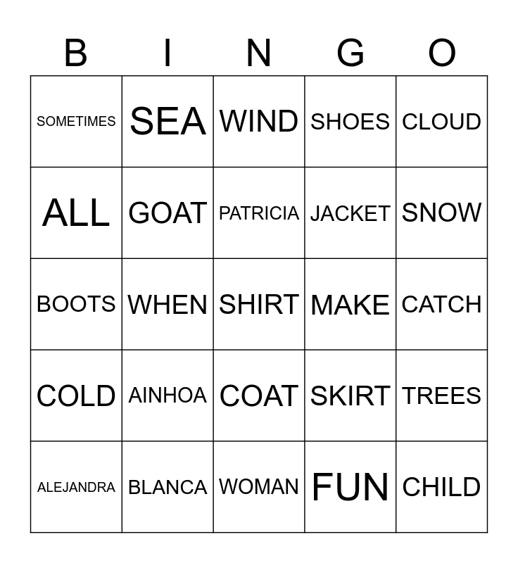 This bingo card has a free space and 24 words: AINHOA, BLANCA, PATRICIA, ALEJANDRA, CLOUD, SOMETIMES, ALL, SEA, MAKE, COAT, JACKET, BOOTS, SKIRT, TREES, GOAT, FUN, CATCH, WIND, SNOW, WHEN, CHILD, COLD, SHOES and WOMAN.