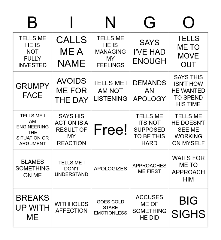 This bingo card has a free space and 24 words: BREAKS UP WITH ME, TELLS ME I DON'T UNDERSTAND, TELLS ME I AM NOT LISTENING, ACCUSES ME OF SOMETHING HE DID, TELLS ME TO MOVE OUT, TELLS ME HE IS NOT FULLY INVESTED, CALLS ME A NAME, TELLS ME HE IS MANAGING MY FEELINGS, TELLS ME ITS NOT SUPPOSED TO BE THIS HARD, TELLS ME HE DOESN'T SEE ME WORKING ON MYSELF, TELLS ME I AM ENGINEERING THE SITUATION OR ARGUMENT, AVOIDS ME FOR THE DAY, APPROACHES ME FIRST, WAITS FOR ME TO APPROACH HIM, GRUMPY FACE, WITHHOLDS AFFECTION, GOES COLD STARE EMOTIONLESS, SAYS I'VE HAD ENOUGH, SAYS THIS ISN'T HOW HE WANTED TO SPEND HIS TIME, BLAMES SOMETHING ON ME, SAYS HIS ACTION IS A RESULT OF MY REACTION, APOLOGIZES, DEMANDS AN APOLOGY and BIG SIGHS.