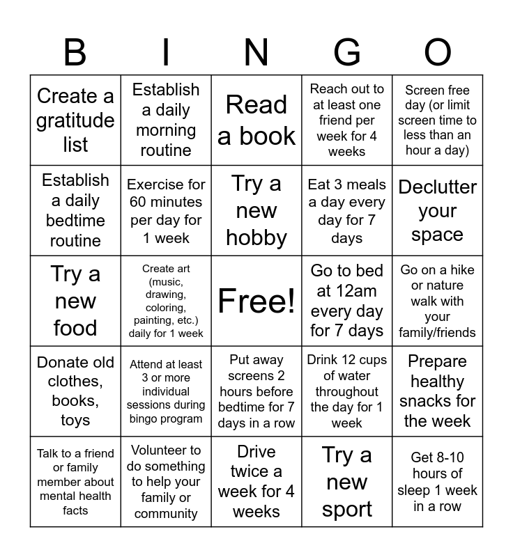 This bingo card has a free space and 24 words: Attend at least 3 or more individual sessions during bingo program, Volunteer to do something to help your family or community, Try a new hobby, Talk to a friend or family member about mental health facts, Screen free day (or limit screen time to less than an hour a day), Create a gratitude list, Establish a daily bedtime routine, Establish a daily morning routine, Go to bed at 12am every day for 7 days, Put away screens 2 hours before bedtime for 7 days in a row, Eat 3 meals a day every day for 7 days, Try a new food, Drink 12 cups of water throughout the day for 1 week, Prepare healthy snacks for the week, Exercise for 60 minutes per day for 1 week, Try a new sport, Go on a hike or nature walk with your family/friends, Read a book, Declutter your space, Create art (music, drawing, coloring, painting, etc.) daily for 1 week, Get 8-10 hours of sleep 1 week in a row, Donate old clothes, books, toys, Reach out to at least one friend per week for 4 weeks and Drive twice a week for 4 weeks.