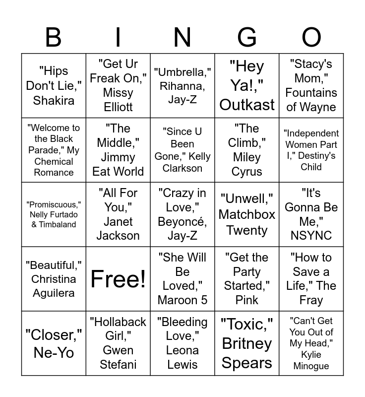 This bingo card has 25 words: Free!, "Bleeding Love," Leona Lewis, "Since U Been Gone," Kelly Clarkson, "Closer," Ne-Yo, "Stacy's Mom," Fountains of Wayne, "Hips Don't Lie," Shakira, "Welcome to the Black Parade," My Chemical Romance, "Get Ur Freak On," Missy Elliott, "Unwell," Matchbox Twenty, "She Will Be Loved," Maroon 5, "The Climb," Miley Cyrus, "Promiscuous," Nelly Furtado & Timbaland, "Get the Party Started," Pink, "How to Save a Life," The Fray, "The Middle," Jimmy Eat World, "Can't Get You Out of My Head," Kylie Minogue, "It's Gonna Be Me," NSYNC, "Umbrella," Rihanna, Jay-Z, "Independent Women Part I," Destiny's Child, "All For You," Janet Jackson, "Crazy in Love," Beyoncé, Jay-Z, "Hollaback Girl," Gwen Stefani, "Beautiful," Christina Aguilera, "Hey Ya!," Outkast and "Toxic," Britney Spears.