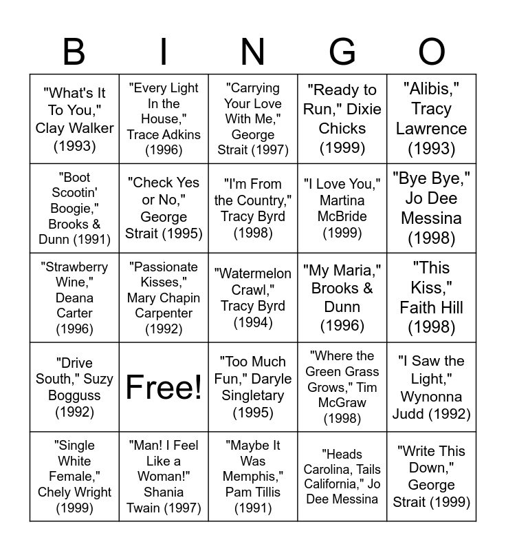 This bingo card has 25 words: Free!, "Maybe It Was Memphis," Pam Tillis (1991), "I'm From the Country," Tracy Byrd (1998), "Single White Female," Chely Wright (1999), "Alibis," Tracy Lawrence (1993), "What's It To You," Clay Walker (1993), "Boot Scootin' Boogie," Brooks & Dunn (1991), "Every Light In the House," Trace Adkins (1996), "My Maria," Brooks & Dunn (1996), "Too Much Fun," Daryle Singletary (1995), "I Love You," Martina McBride (1999), "Strawberry Wine," Deana Carter (1996), "Where the Green Grass Grows," Tim McGraw (1998), "I Saw the Light," Wynonna Judd (1992), "Check Yes or No," George Strait (1995), "Write This Down," George Strait (1999), "This Kiss," Faith Hill (1998), "Carrying Your Love With Me," George Strait (1997), "Bye Bye," Jo Dee Messina (1998), "Passionate Kisses," Mary Chapin Carpenter (1992), "Watermelon Crawl," Tracy Byrd (1994), "Man! I Feel Like a Woman!" Shania Twain (1997), "Drive South," Suzy Bogguss (1992), "Ready to Run," Dixie Chicks (1999) and "Heads Carolina, Tails California," Jo Dee Messina.