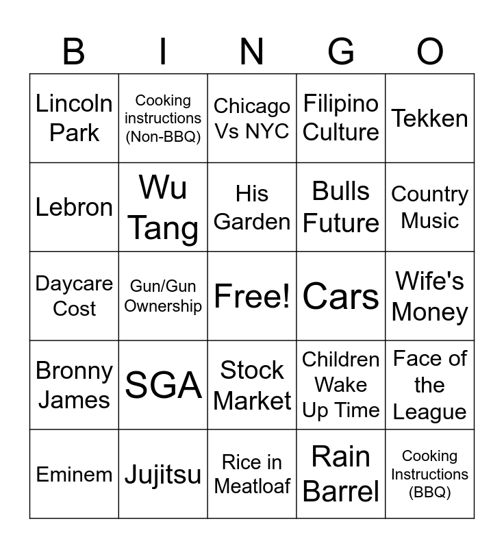 This bingo card has a free space and 25 words: Eminem, SGA, His Garden, Rain Barrel, Country Music, Lincoln Park, Cooking instructions (Non-BBQ), Chicago Vs NYC, Bulls Future, Face of the League, Daycare Cost, Wu Tang, Children Wake Up Time, Cooking Instructions (BBQ), Lebron, Jujitsu, Rice in Meatloaf, Filipino Culture, Wife's Money, Bronny James, Gun/Gun Ownership, Stock Market, Cars, Tekken and HYSA.