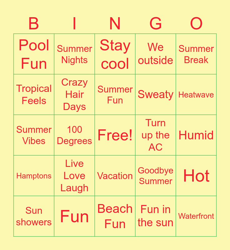 This bingo card has a free space and 24 words: Sun showers, Live Love Laugh, Summer Fun, Fun in the sun, Summer Break, Pool Fun, Summer Nights, Stay cool, Turn up the AC, Humid, Summer Vibes, Crazy Hair Days, Goodbye Summer, Hot, Tropical Feels, Fun, Beach Fun, We outside, Heatwave, Hamptons, 100 Degrees, Vacation, Sweaty and Waterfront.