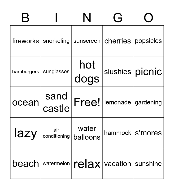 This bingo card has a free space and 44 words: summer, sunshine, pool, beach, swimming, vacation, sunscreen, ice cream, popsicles, watermelon, cherries, lemonade, water balloons, air conditioning, play, relax, sand, ocean, BBQ, picnic, snorkeling, camping, county fair, fireworks, flip flops, gardening, games, hot, hammock, lazy, mangoes, s’mores, nature, road trip, sand castle, surfing, tropical, waves, hot dogs, hamburgers, slushies, memories, sunglasses and coconut.
