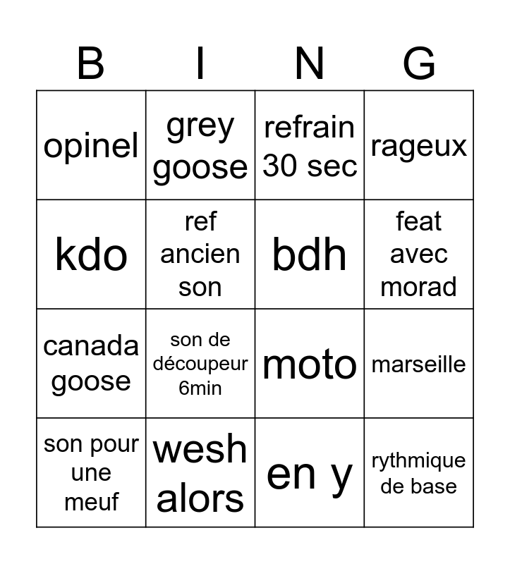This bingo card has 16 words: wesh alors, marseille, refrain 30 sec, opinel, canada goose, grey goose, moto, en y, kdo, ref ancien son, son pour une meuf, rageux, son de découpeur 6min, feat avec morad, bdh and rythmique de base.