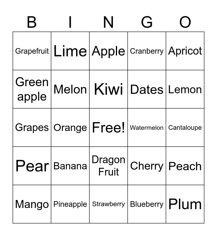 This bingo card has a free space and 24 words: Banana, Pineapple, Kiwi, Mango, Apricot, Grapefruit, Green apple, Lime, Watermelon, Dragon Fruit, Dates, Grapes, Cherry, Peach, Melon, Blueberry, Cantaloupe, Apple, Lemon, Orange, Plum, Pear, Cranberry and Strawberry.