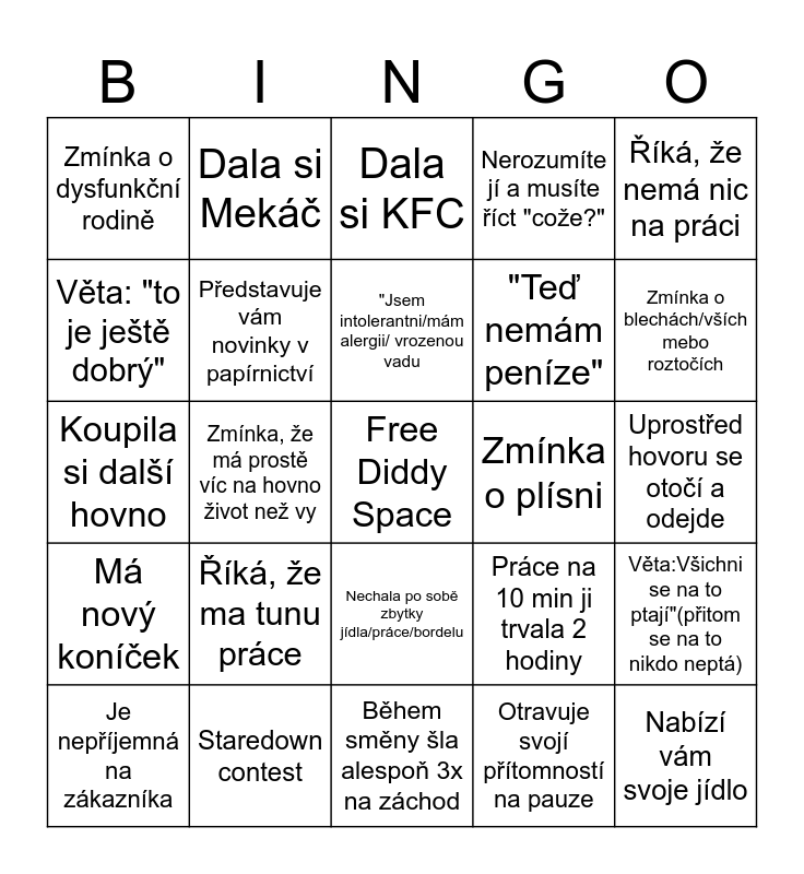 This bingo card has a free space and 24 words: Říká, že ma tunu práce, Staredown contest, "Jsem intolerantni/mám alergii/ vrozenou vadu, Je nepříjemná na zákazníka, Říká, že nemá nic na práci, Zmínka o dysfunkční rodině, Věta: "to je ještě dobrý", Dala si Mekáč, Zmínka o plísni, Nechala po sobě zbytky jídla/práce/bordelu, "Teď nemám peníze", Koupila si další hovno, Práce na 10 min ji trvala 2 hodiny, Věta:Všichni se na to ptají"(přitom se na to nikdo neptá), Představuje vám novinky v papírnictví, Otravuje svojí přítomností na pauze, Uprostřed hovoru se otočí a odejde, Dala si KFC, Zmínka o blechách/vších mebo roztočích, Zmínka, že má prostě víc na hovno život než vy, Nabízí vám svoje jídlo, Má nový koníček, Nerozumíte jí a musíte říct "cože?" and Během směny šla alespoň 3x na záchod.