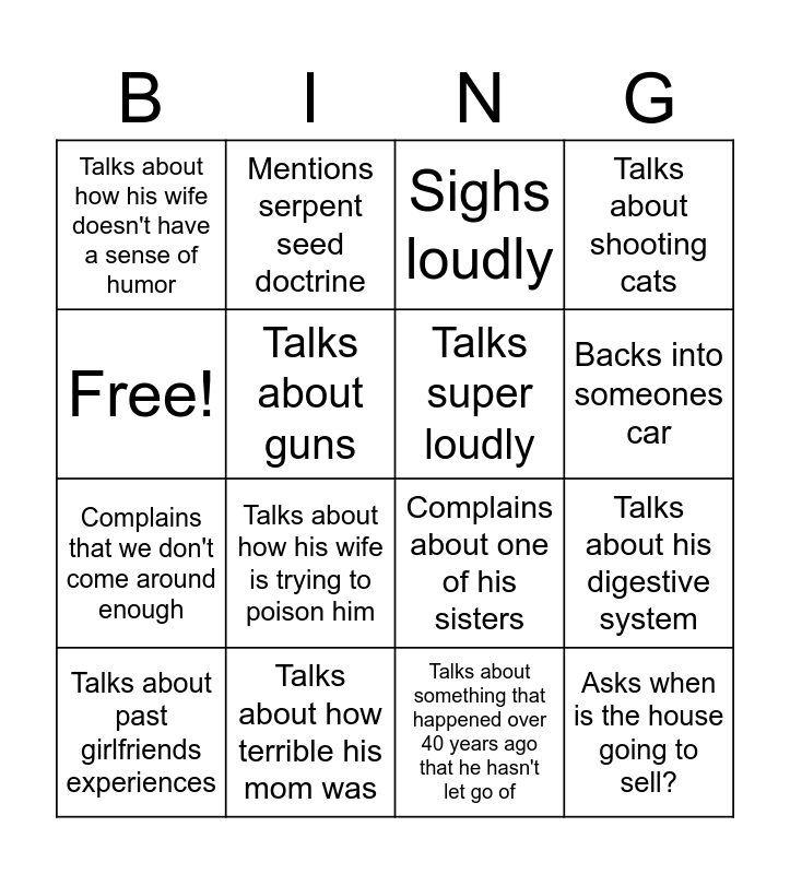 This bingo card has 16 words: Talks about how terrible his mom was, Talks about his digestive system, Sighs loudly, Talks about how his wife doesn't have a sense of humor, Complains that we don't come around enough, Mentions serpent seed doctrine, Complains about one of his sisters, Talks about something that happened over 40 years ago that he hasn't let go of, Free!, Talks about guns, Talks about past girlfriends experiences, Talks about shooting cats, Talks about how his wife is trying to poison him, Backs into someones car, Talks super loudly and Asks when is the house going to sell?.