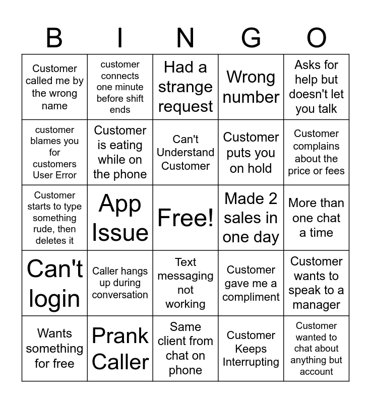 This bingo card has a free space and 24 words: Caller hangs up during conversation, Prank Caller, Can't Understand Customer, Wants something for free, Asks for help but doesn't let you talk, Customer called me by the wrong name, customer blames you for customers User Error, customer connects one minute before shift ends, Made 2 sales in one day, Text messaging not working, Customer puts you on hold, Customer starts to type something rude, then deletes it, Customer gave me a compliment, Customer wants to speak to a manager, Customer is eating while on the phone, Customer Keeps Interrupting, More than one chat a time, Had a strange request, Customer complains about the price or fees, App Issue, Customer wanted to chat about anything but account, Can't login, Wrong number and Same client from chat on phone.