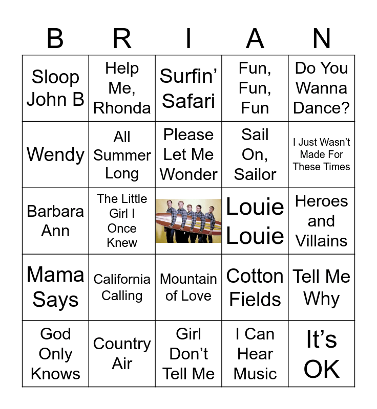 This bingo card has a free space and 75 words: California Girls, Do It Again, Surfin’ Safari, Catcha Wave, Little Honda, Surfin’ USA, Surfer Girl, Don’t Worry Baby, Little Deuce Coupe, Shut Down, I Get Around, The Warmth of the Sun, Please Let Me Wonder, Wendy, Getcha Back, The Little Girl I Once Knew, When I Grow Up, It’s OK, Dance, Dance, Dance, Do You Wanna Dance?, Rock And Roll Music, Barbara Ann, All Summer Long, Help Me, Rhonda, Fun, Fun, Fun, Kokomo, You’re So Good to Me, Wild Honey, Darlin’, In My Room, All This Is That, The Whole World, Add Some Music To Your Day, Cotton Fields, I Just Wasn’t Made For These Times, Sail On, Sailor, Surf’s Up, Friends, Heroes and Villains, I Can Hear Music, Good Timin’, California Saga, Isn’t It Time, Kiss Me, Baby, That’s Why God Made The Radio, Forever, God Only Knows, Sloop John B, Wouldn’t It Be Nice, Good Vibrations, Caroline, No, Mountain of Love, South Bay Surfer, Hawaii, Our Car Club, 409, Boogie Woodie, Deirdre, Crack At Your Love, Passing By, California Calling, I Do Love You, Full Sail, Love Surrounds Me, Why Do Fools Fall In Love, Louie Louie, Alley Oop, Hully Gully, Papa-Oom-Mow-Mow, Tell Me Why, Mama Says, Country Air, Let Him Run Wild, Girl Don’t Tell Me and Don’t Back Down.