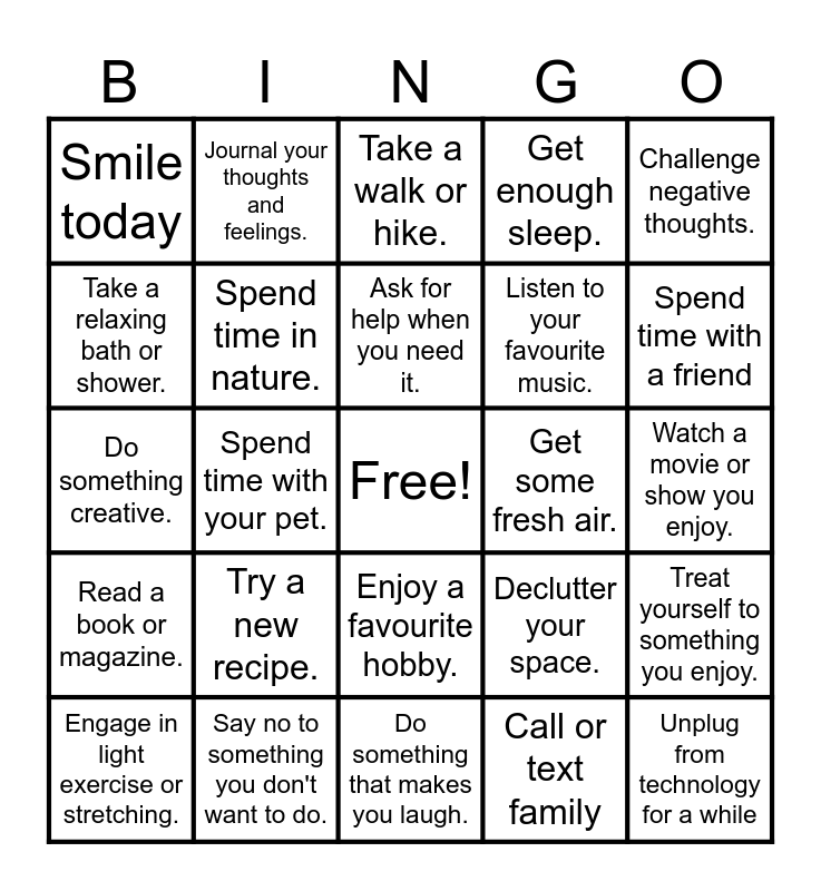 This bingo card has a free space and 28 words: Set a personal boundary., Say no to something you don't want to do., Ask for help when you need it., Call or text family, Challenge negative thoughts., Smile today, Spend time in nature., Do something that makes you laugh., Get some fresh air., Treat yourself to something you enjoy., Do something creative., Spend time with your pet., Declutter your space., Unplug from technology for a while, Take a relaxing bath or shower., Wear an outfit you love, Enjoy a favourite hobby., Get enough sleep., Spend time with a friend, Engage in light exercise or stretching., Journal your thoughts and feelings., Prepare and enjoy a healthy meal., Listen to your favourite music., Watch a movie or show you enjoy., Read a book or magazine., Try a new recipe., Take a walk or hike. and Spend time with loved ones..